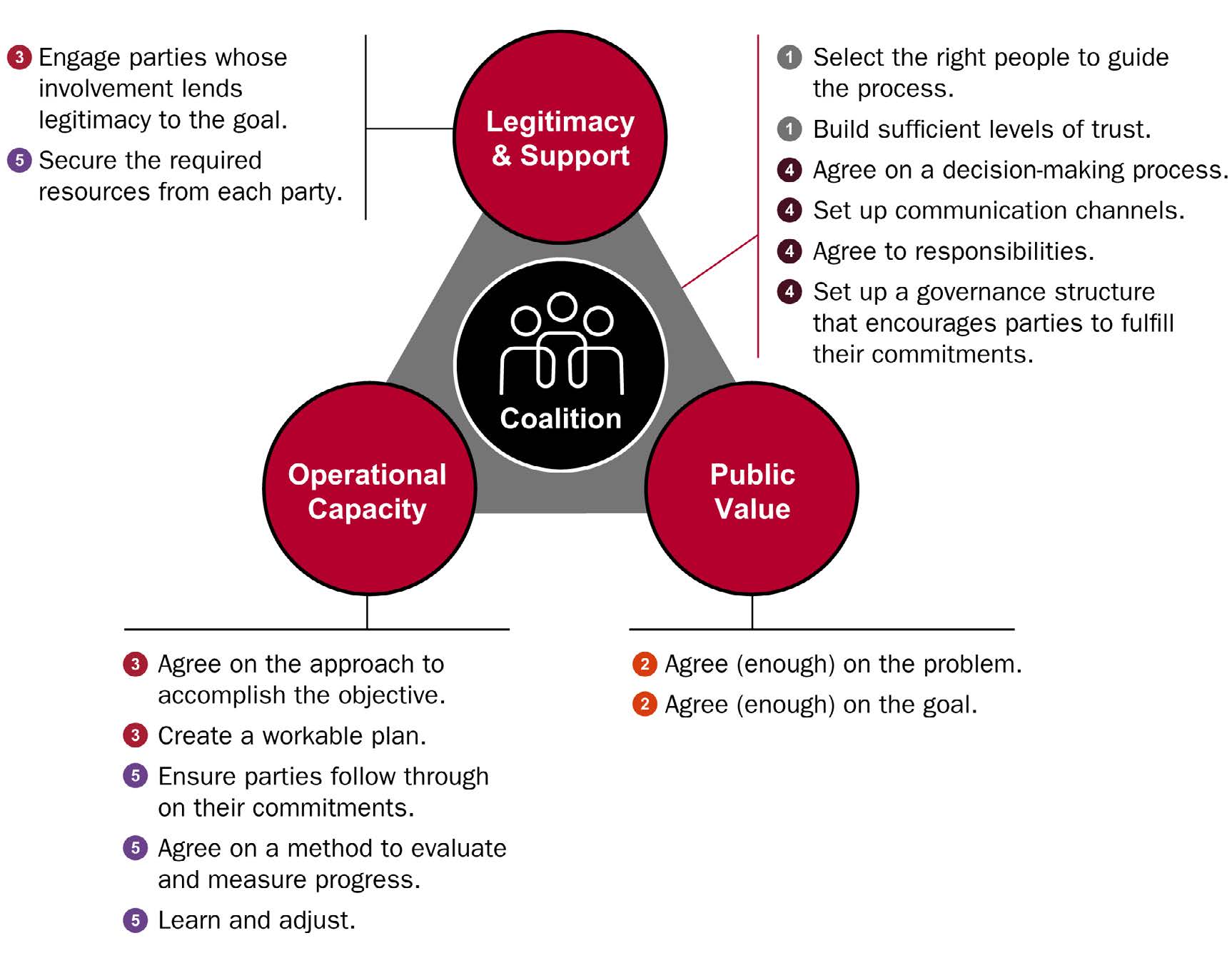 The first tool builds on the Strategic Triangle, a framework from public value theory. The Strategic Triangle for Collaborative Solutions takes the critical tasks needed for collaboration and overlays them with three key dimensions of social problem-solving. Teams can use the tool to understand the tasks every coalition needs to accomplish to be effective and develop a shared view of: